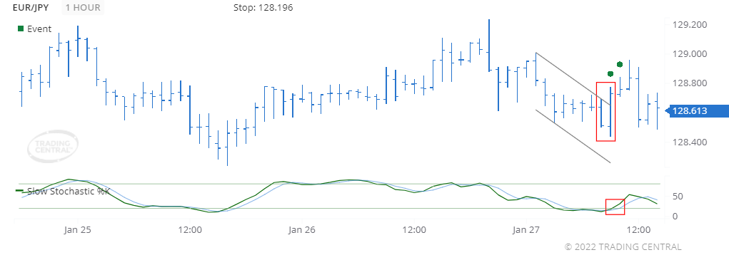 A bullish event triggered for Slow Stochastics on 2022 Jan 27 at 10:00 GMT when the %K line crossed above the %D line. The close prices are trading closer to the upper end of the recent high-low price range, which is associated with price increases.