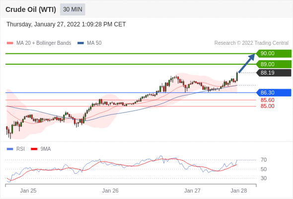 Long positions above 86.30 with targets at 89.00 & 90.00 in extension.
