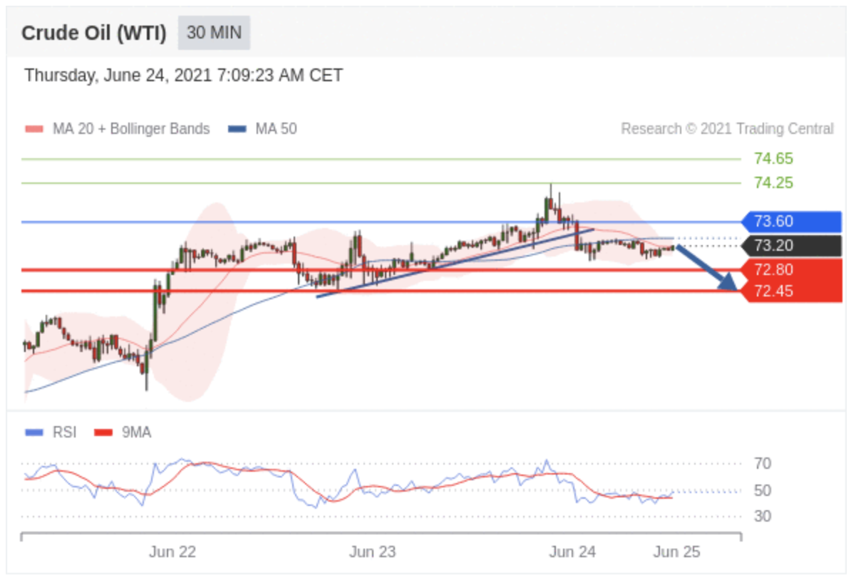 Short positions below 73.60 with targets at 72.80 & 72.45 in extension.