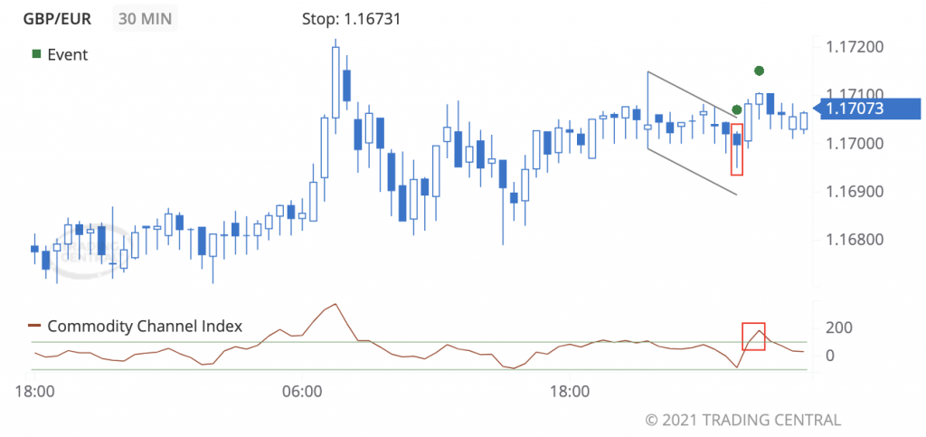The CCI triggered a bullish signal on 2021 Jun 24 at 02:30 GMT by crossing above the +100% level.