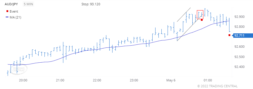 A bearish event triggered for Slow Stochastics on 2022 May 05 at 21:00 GMT when the %K line crossed below the %D line. The close prices are trading closer to the lower end of the recent high-low price range, which is associated with price decreases.