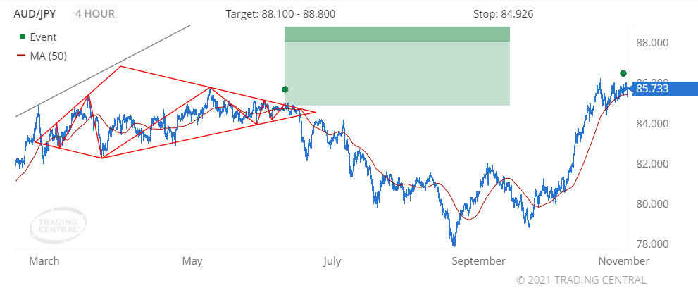 We found a pattern called Continuation Diamond (Bullish) on 2021 Jun 10 at 13:00 GMT on a 4 hour chart, providing a target price for up to 2 weeks in the range of 88.100 to 88.800.