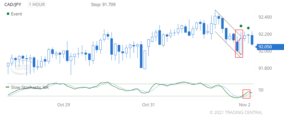 A bullish event triggered for Slow Stochastics on 2021 Nov 02 at 01:00 GMT when the %K line crossed above the %D line. The close prices are trading closer to the upper end of the recent high-low price range, which is associated with price increases.