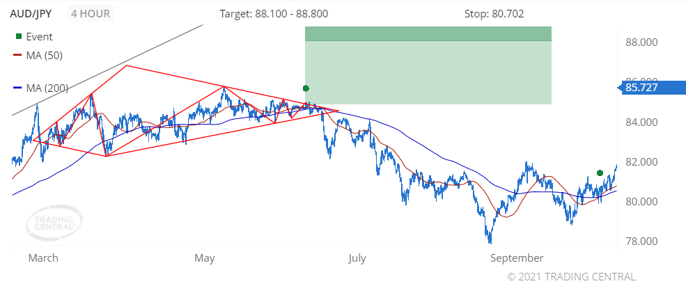 We found a pattern called Continuation Diamond (Bullish) on 2021 Jun 10 at 13:00 GMT on a 4 hour chart, providing a target price for up to 2 weeks in the range of 88.100 to 88.800.