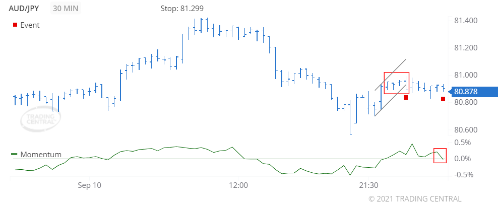 The Momentum oscillator crossed below 0 on 2021 Sep 13 at 03:30 GMT, thereby signaling a new accelerating downtrend.