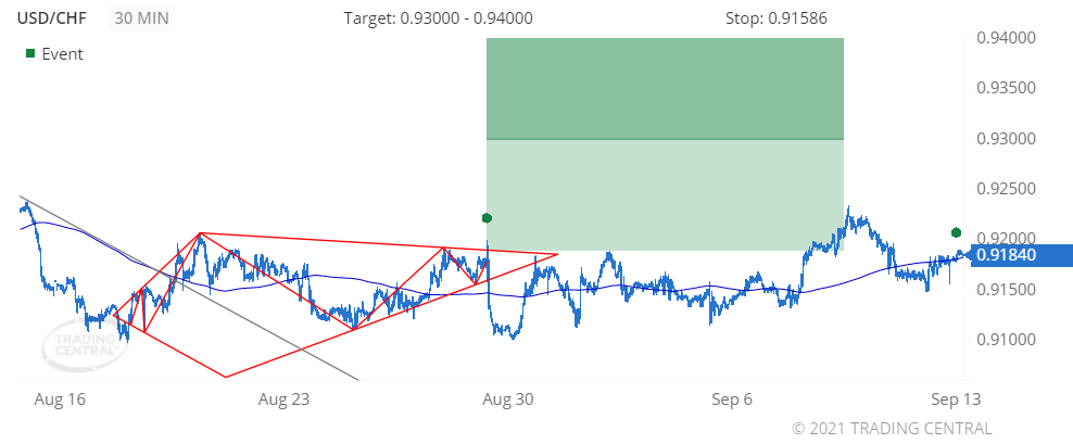 We found a pattern called Diamond Bottom on 2021 Aug 27 at 13:30 GMT on a 30 minute chart, providing a target price for up to 2 weeks in the range of 0.93000 to 0.94000.