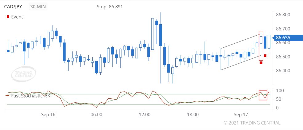A bearish event triggered for Fast Stochastics on 2021 Sep 17 at 03:00 GMT when the %K line crossed below the %D line. The close prices are trading closer to the lower end of the recent high-low price range, which is associated with price decreases.