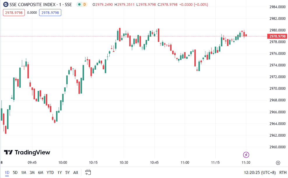 - Shanghai Composite Index (SHCOMP) rose by 0.43%, closing at 2,978.98 points.