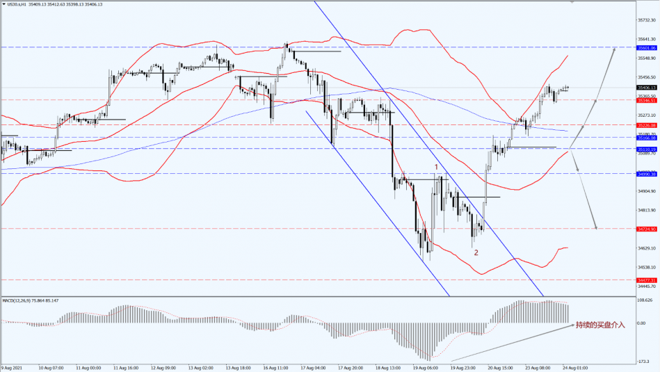 The future market should focus mainly on the 35110 line. As long as the Dow does not fall below the 35110 range, it will still maintain the bullish trend and look for the opportunity to intervene again after the fourth wave retracement stabilizes. Therefore, it is necessary to pay attention on the support of 35346, 35226, and 35110 lines. On the top, focus on the strength of the re-suppression of the historical high of the 35601 position.