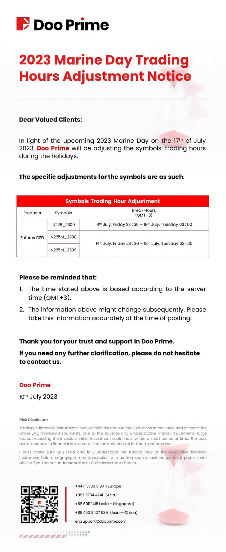 2023-07-10 | Holiday Hours , Trading Hours Adjustment