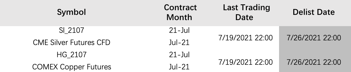The following table indicates the futures contract that are approaching the delivery date for July. After the expiration date, the corresponding futures contract cannot be traded anymore. For expiration details, please refer to the tables below.