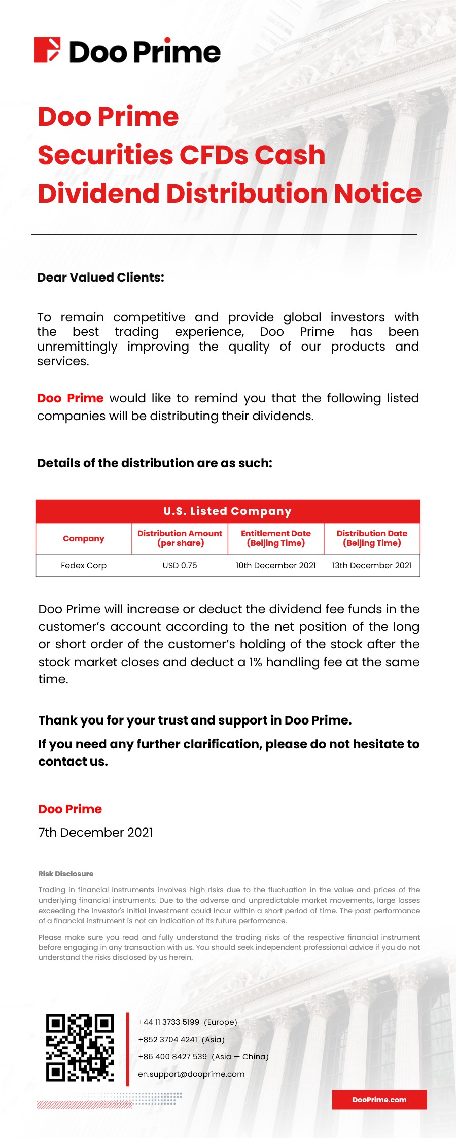 Doo Prime Securities CFDs Cash Dividend Distribution Notice