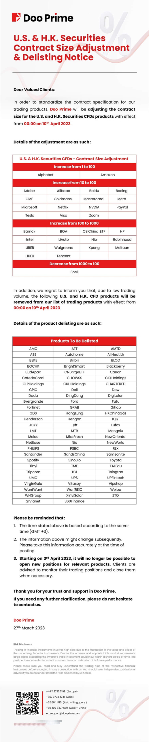 Doo Prime U.S. & H.K. Securities Contract Size Adjustment & Delisting Notice