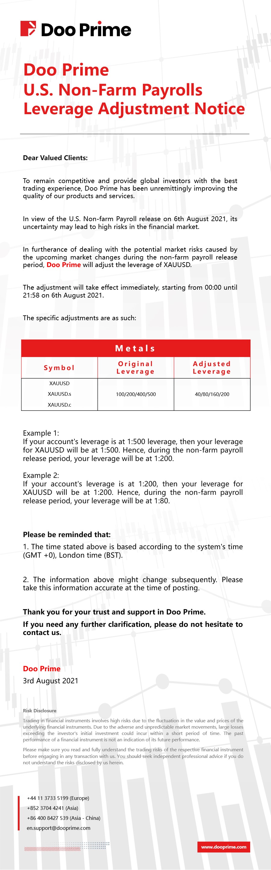 2021-08-03 | Leverage Adjustment Notice , US Non-Farm Payrolls Leverage Adjustment Notice
