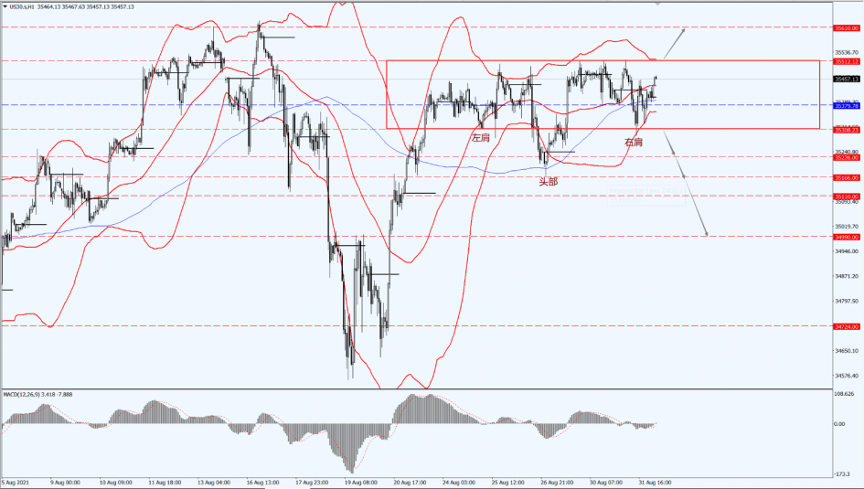 The Dow has formed a top head and shoulders pattern at its high yesterday, and the basic operating range is still maintained at 35308–35512. Therefore, pay attention to the direction of the Dow’s breakthrough in the range of 35308–35512. If it breaks through the 35512 line, it means that it advances through the neck line of the head and shoulders pattern, which will open up further upward trend for the Dow.