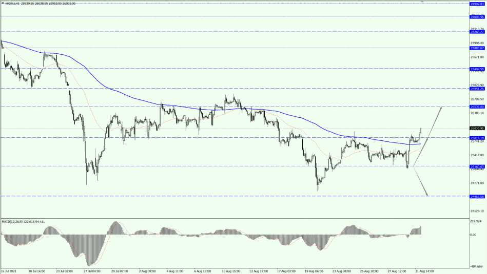HK50 received a strong support from the buying of the 25160 line yesterday, and reversed the trend into an upward movement. Today, we pay attention to its continued upward strength. Above, focus on the suppression strength of the 26535 line, and keep an eye on the 25816 and 25160 positions below. Once HK50 falls below the 25160 line, it will open up further downward revision.