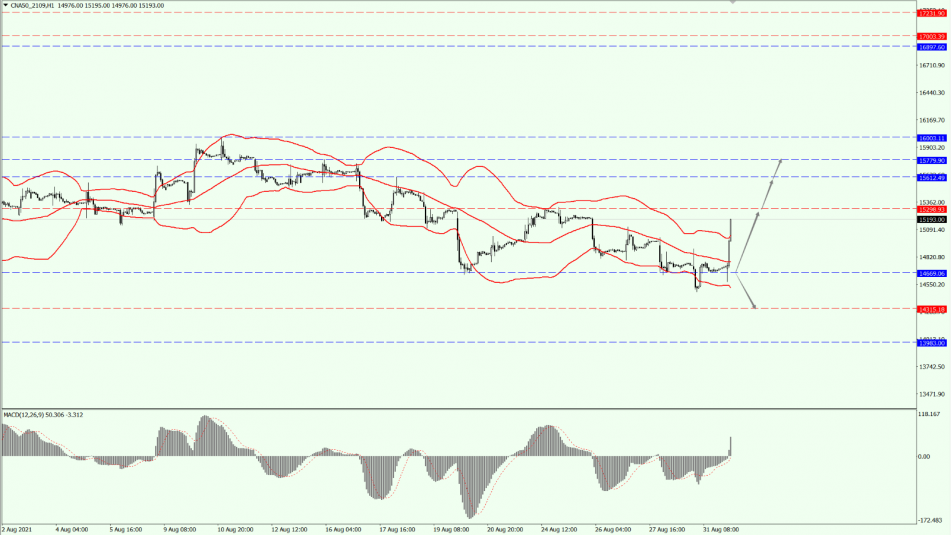 A50 formed a bear trap yesterday, and stood above the middle Bollinger Band again, starting a strong upward trend before the market changed. Today, the top focuses on the suppression strength of the two positions 15298 and 15612, and the support of the 14669 line below. As long as A50 does not fall below the 14669 line, it maintains a bullish trend.