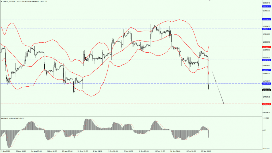 China A50 is still looking bearish today. Pay attention to the resistance of the two positions at 14899 and 14669 above, and the support of the 14315 line below.