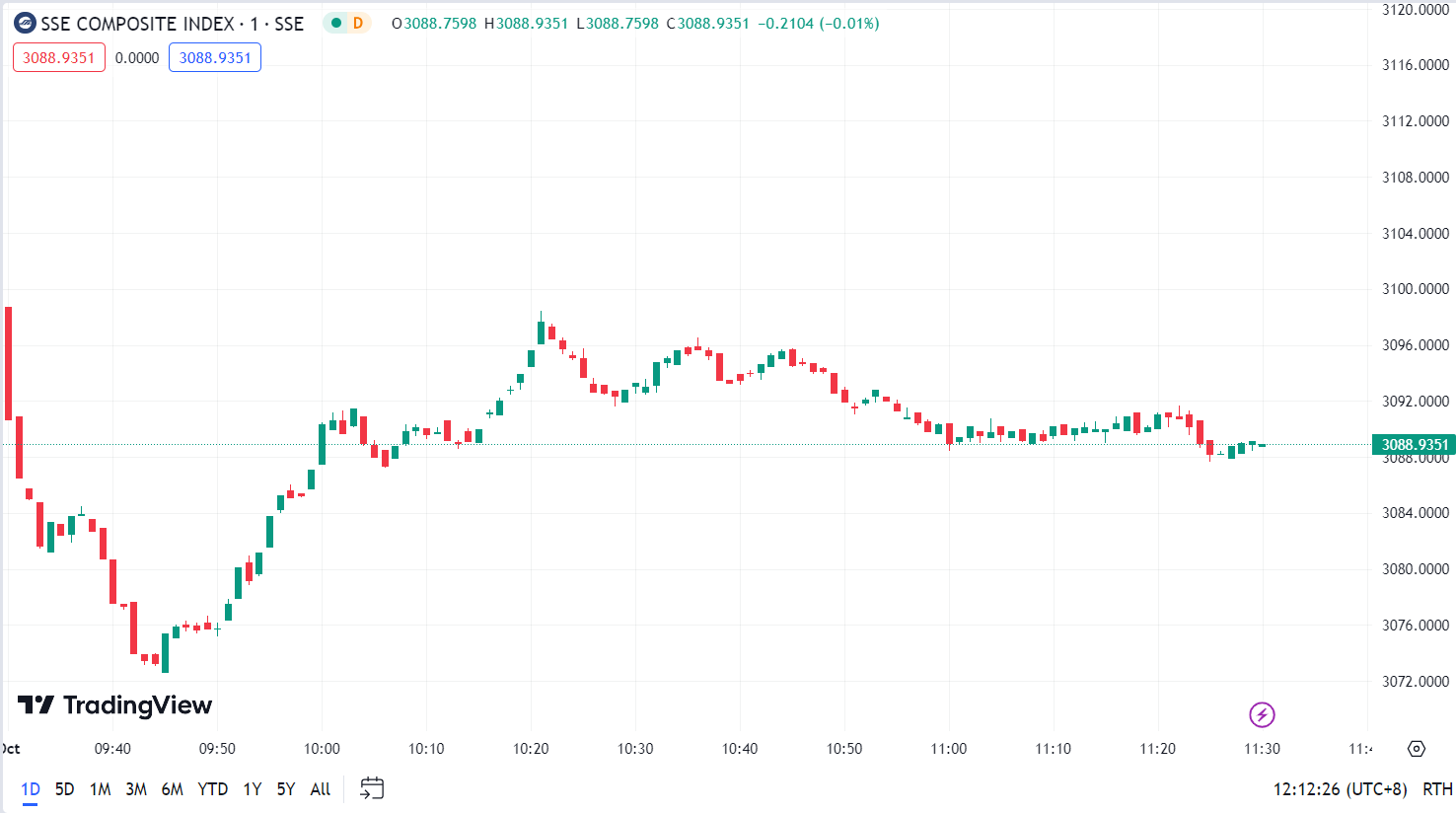 - Shanghai Composite Index (SHCOMP) fell by 0.69%, closing at 3,088.94 points.