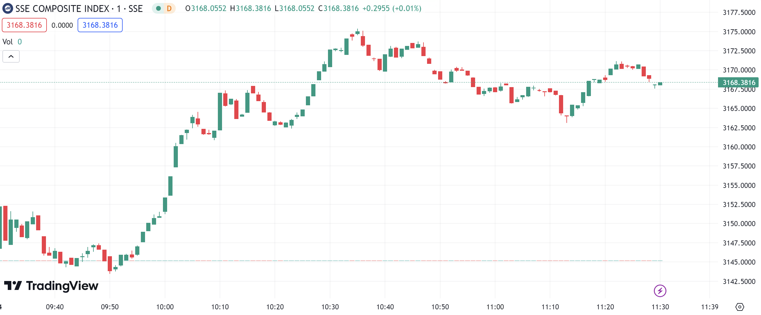 - Shanghai Composite Index (SHCOMP) rose by 1.12%, closing at 3,168.38 points.