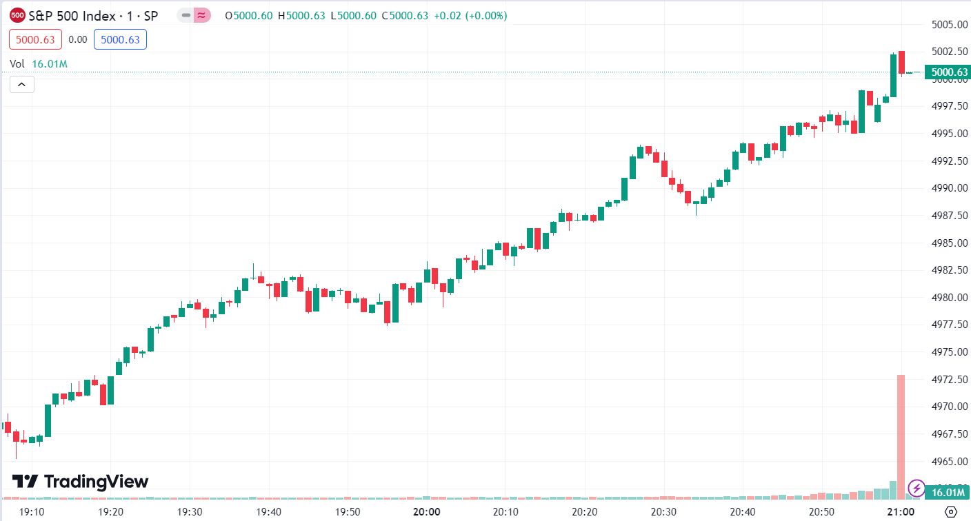 - S&P 500 Index rose 47.45 points, or 0.96%, to close at 5,000.62.