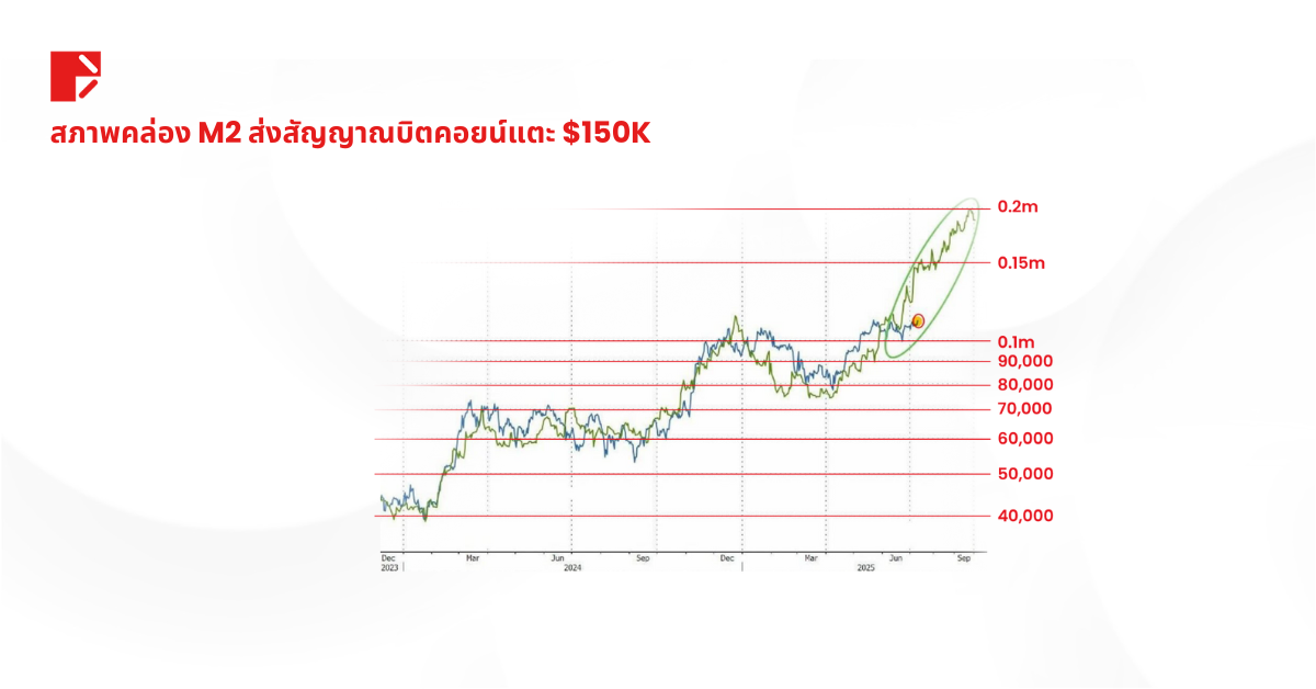 กราฟ M2 ทำตัวเหมือนตัวชี้นำล่วงหน้า 12 สัปดาห์ของบิตคอยน์ ทุกครั้งที่ M2 ขยับขึ้น บิตคอยน์ก็มักจะตามมา ตอนนี้มันชี้ไปที่แนวโน้มที่อาจแตะระดับอย่างน้อย 150,000 ดอลลาร์ ซึ่งเทรดเดอร์ก็กำลังจับตาดูอย่างใกล้ชิด และนั่นยิ่งเติมเชื้อไฟให้กับการพุ่งขึ้นของตลาดในตอนนี้