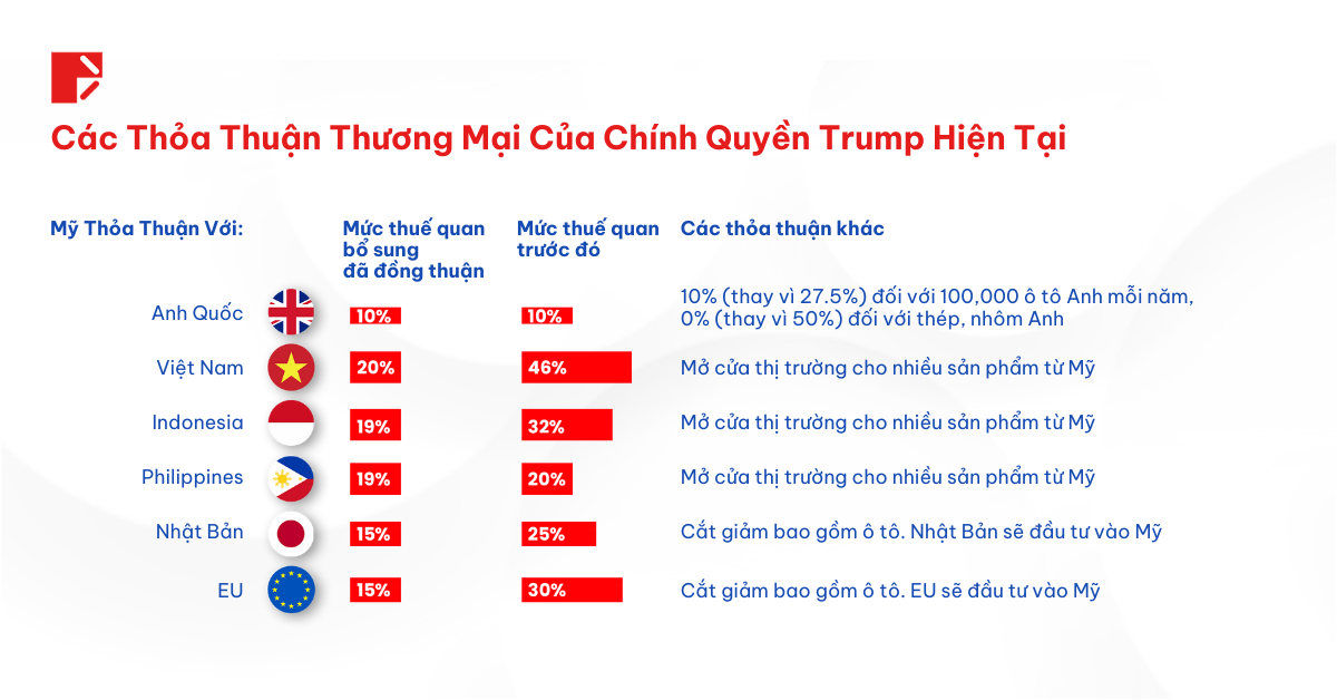 Như được thể hiện trong biểu đồ bên dưới, kể từ khi Mỹ công bố tăng thuế vào tháng 4/2025, thì nước này đã ký hoặc phác thảo các điều khoản thương mại mới với Anh, Việt Nam, Indonesia, Philippines và Nhật Bản. Theo đó, mỗi thỏa thuận đều giảm mức thuế so với mức công bố trước đó, đồng thời khẳng định mở rộng cửa chào đón cho hàng hóa từ Mỹ.