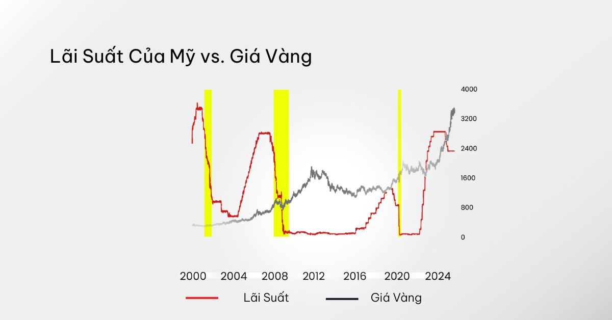 • 2001-2003: Fed cắt giảm lãi suất, vàng gần như tăng lên gấp đôi