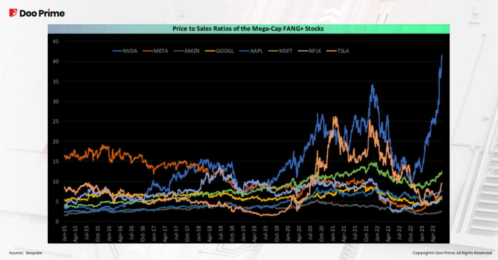 Vào thời điểm bài viết này được viết, giá cổ phiếu NVIDIA đã tăng lên vọt 207.72% kể từ đầu năm, chạm đến mức giá ấn tượng 457.87 USD/ cổ phiếu. Dù vậy, tỉ lệ giá trên doanh thu lại vượt xa so với Meta, Amazon, Google, Apple, Microsoft, Netflix hay Tesla. Tỉ lệ giá trên trên doanh thu cao đồng nghĩa với giá trị đầu tư kém hấp dẫn cho cổ phiếu của công ty đó.