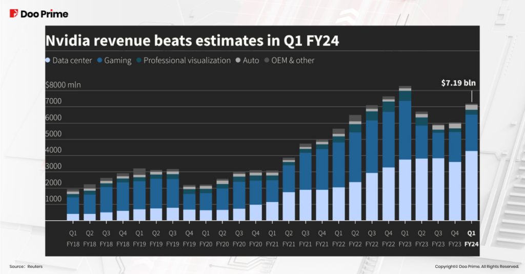 Trong báo cáo tài chính Q1 FY2024 của NVIDIA, doanh thu và lợi nhuận ròng của họ vượt xa mức mong đợi của thị trường. Đáng chú ý, trong 4 lĩnh vực kinh doanh chính của họ bao gồm: Trung tâm dữ liệu (Data centers); Trò chơi điện tử (Gaming); Mô phỏng hóa (Professtional Visualization); Xe hơi (Automotive), thì mảng Data centers cho thấy mức tăng trưởng doanh thu ổn định nhất.