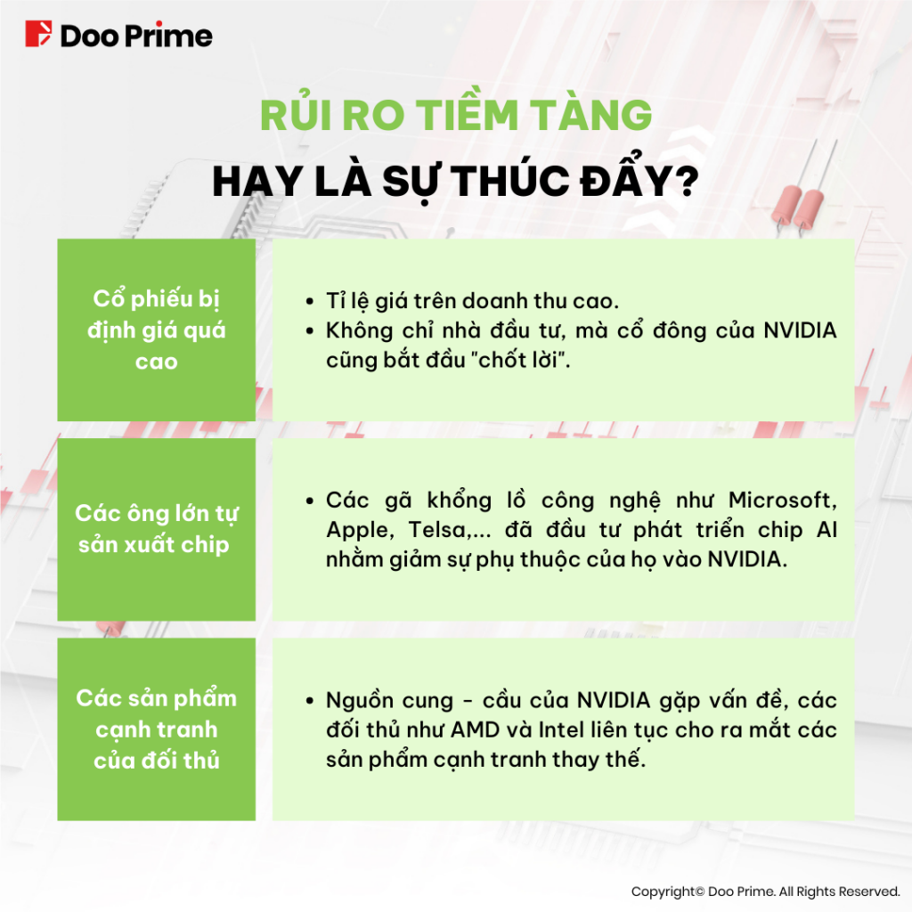 Tuy nhiên, nhiều người cho rằng cổ phiếu của NVIDIA đang bị đánh giá quá cao. Cộng với những áp lực từ các ông lớn công nghệ và các đối thủ trong nội tại ngành liên tục cho ra các sản phẩm thay thế, vị thế dẫn đầu của NVIDIA đang bị đe dọa.