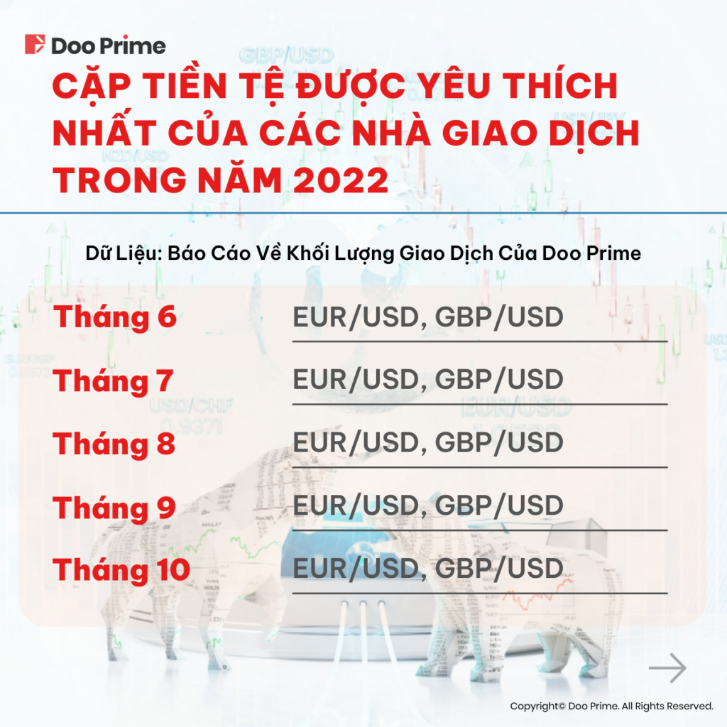 Ngay dưới đây, chúng tôi đã tổng hợp một danh sách các cặp tiền tệ được yêu thích nhất trong năm 2022 dựa trên báo cáo về khối lượng giao dịch của Doo Prime.
